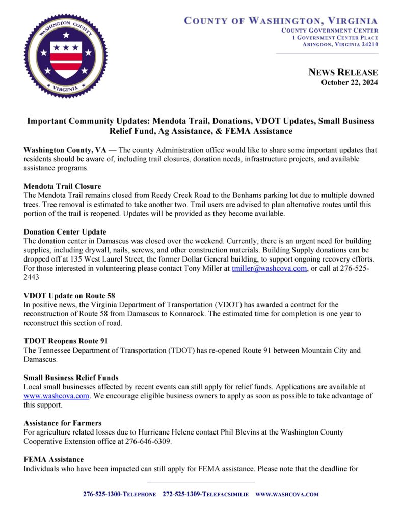 Alicia Roland October 22, 2024 Uncategorized Post navigation Previous Previous post: Road Closure Announcement for Highway 91 May Affect Citizens In Taylor’s ValleyNext Next post: News Release: Washington County Small Business Relief Fund Update