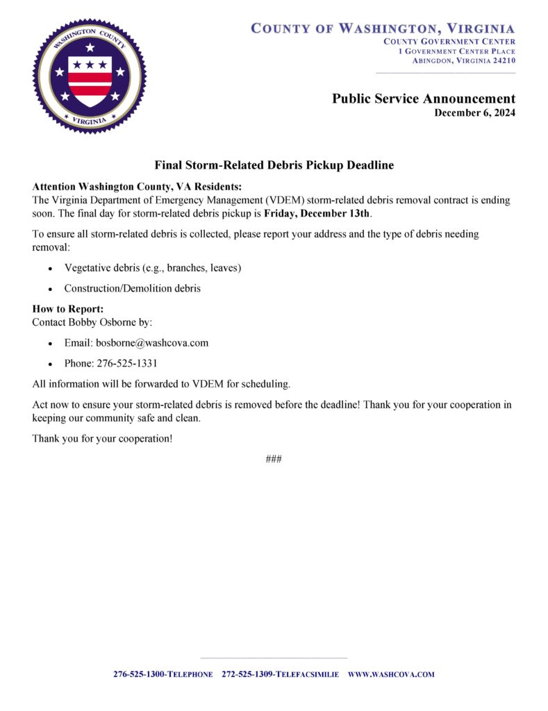 Alicia Roland December 6, 2024 Uncategorized Post navigation Previous Previous post: News Release Hurricane Helene Survivors in Va. May Be Eligible for Reimbursement for Damage-Related Home RepairsNext Next post: Washington County Board of Supervisors Addresses Rising Property Assessments