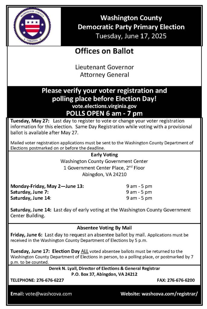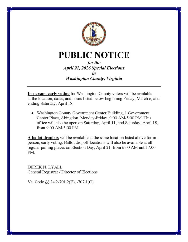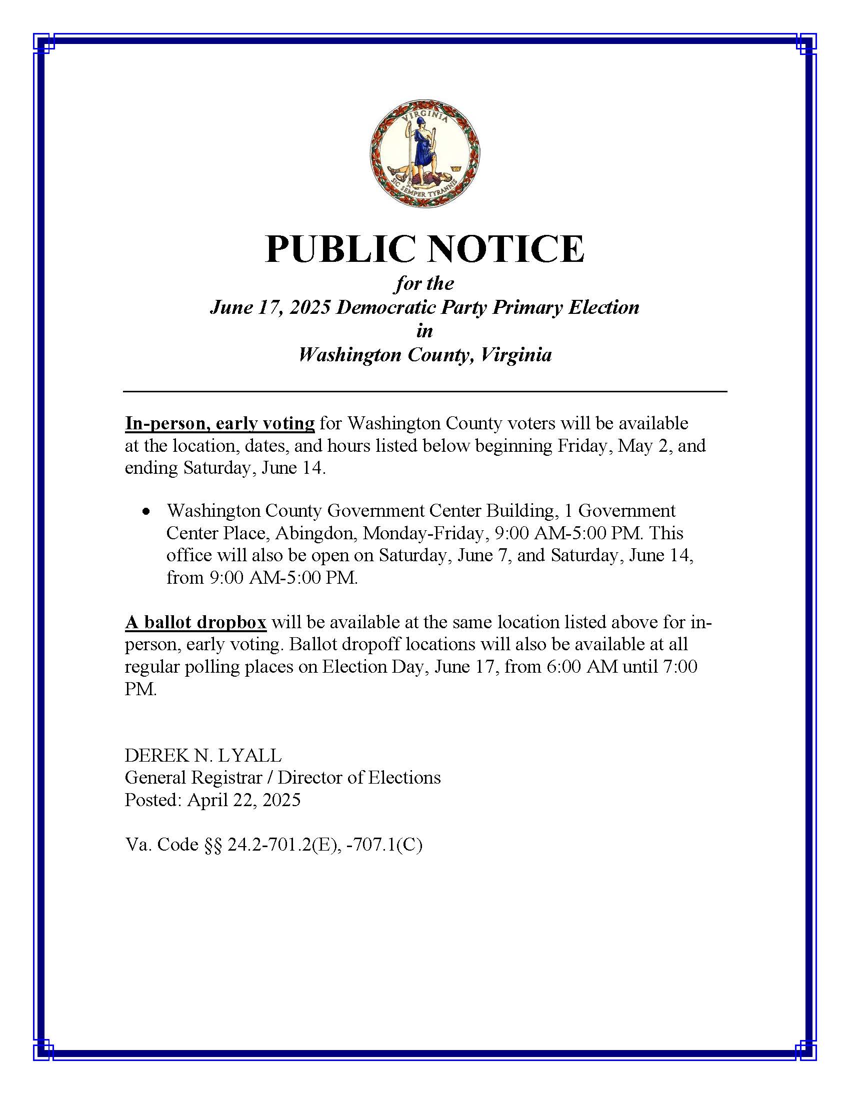 The Office of the General Voter Registrar of Washington County strives to promote the highest level of service to its citizens by providing equitable opportunities to register and vote; and by maintaining accurate records relating to voter registration, elections, and candidates. The Registrar and County Electoral Board are committed to providing each citizen the opportunity to exercise his or her right to vote in accordance with the Constitution of the United States and the Commonwealth of Virginia, and the Code of Virginia thus ensuring fair and impartial elections. The General Voter Registrar is appointed by the Washington County Electoral Board, composed of three members appointed by a majority of the circuit judges of the 28th Judicial Circuit of which Washington County is part.